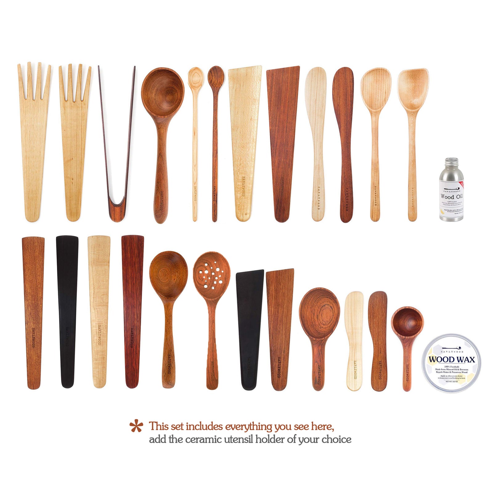 Our over the top set of cooking utensils will inspire you to cook more. Each piece is handcrafted from durable hardwoods and designed to be fully functional. This is the perfect balance of beauty and function that makes our wooden utensils stand out!