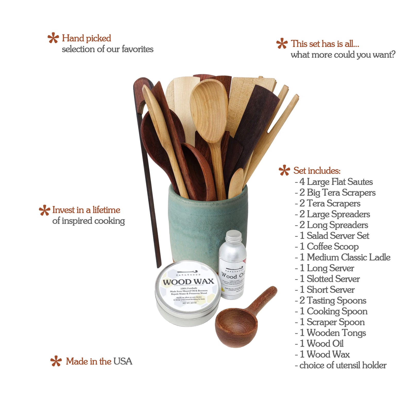 This set has the perfect mix of cooking implements whether you’re an amateur home cook or an expert chef. From wooden spatulas, tasting spoons, to classic servers, cooking spoons, a coffee scoop and even the oil and wax to keep them in great shape. This bundle has everything you need to whip up delicious meals on the daily!