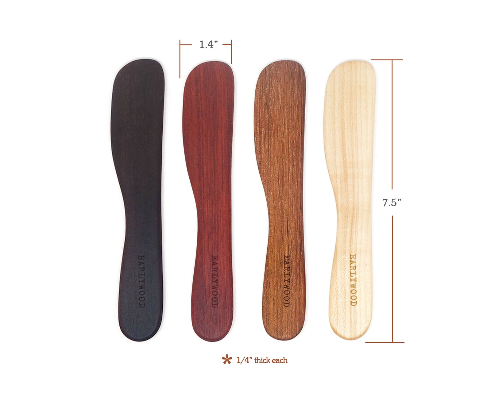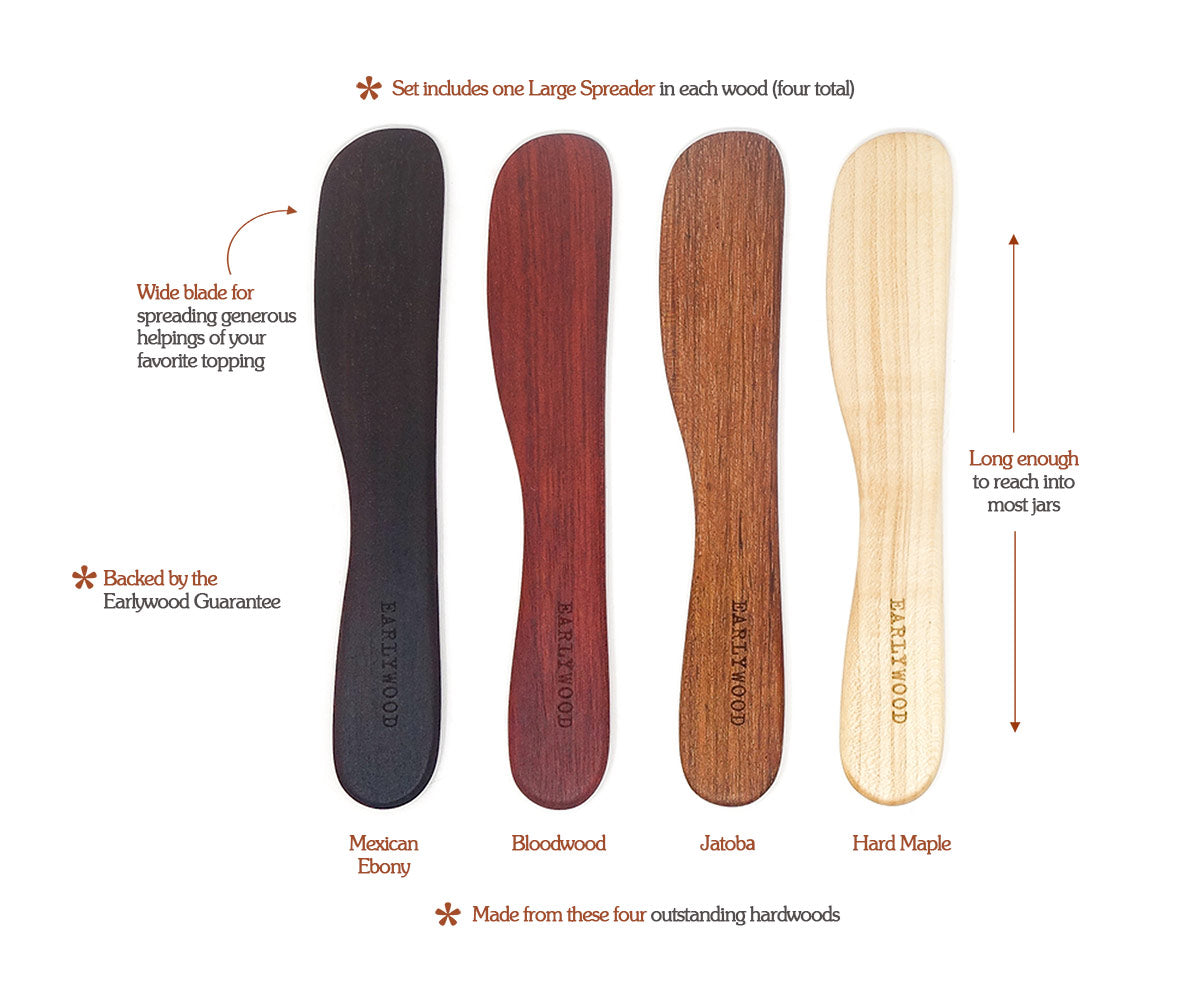This set includes four wooden spreaders from your choice of hardwoods or a combo of all. The spreaders in this bundle are beautifully smooth and incredibly versatile. Thoughtfully designed and handcrafted, our wooden butter knives are made for spreading. The length allows you to reach the bottom of jars while the wide, unbending edge easily spreads butter, jam tapenade, or your favorite Camembert.