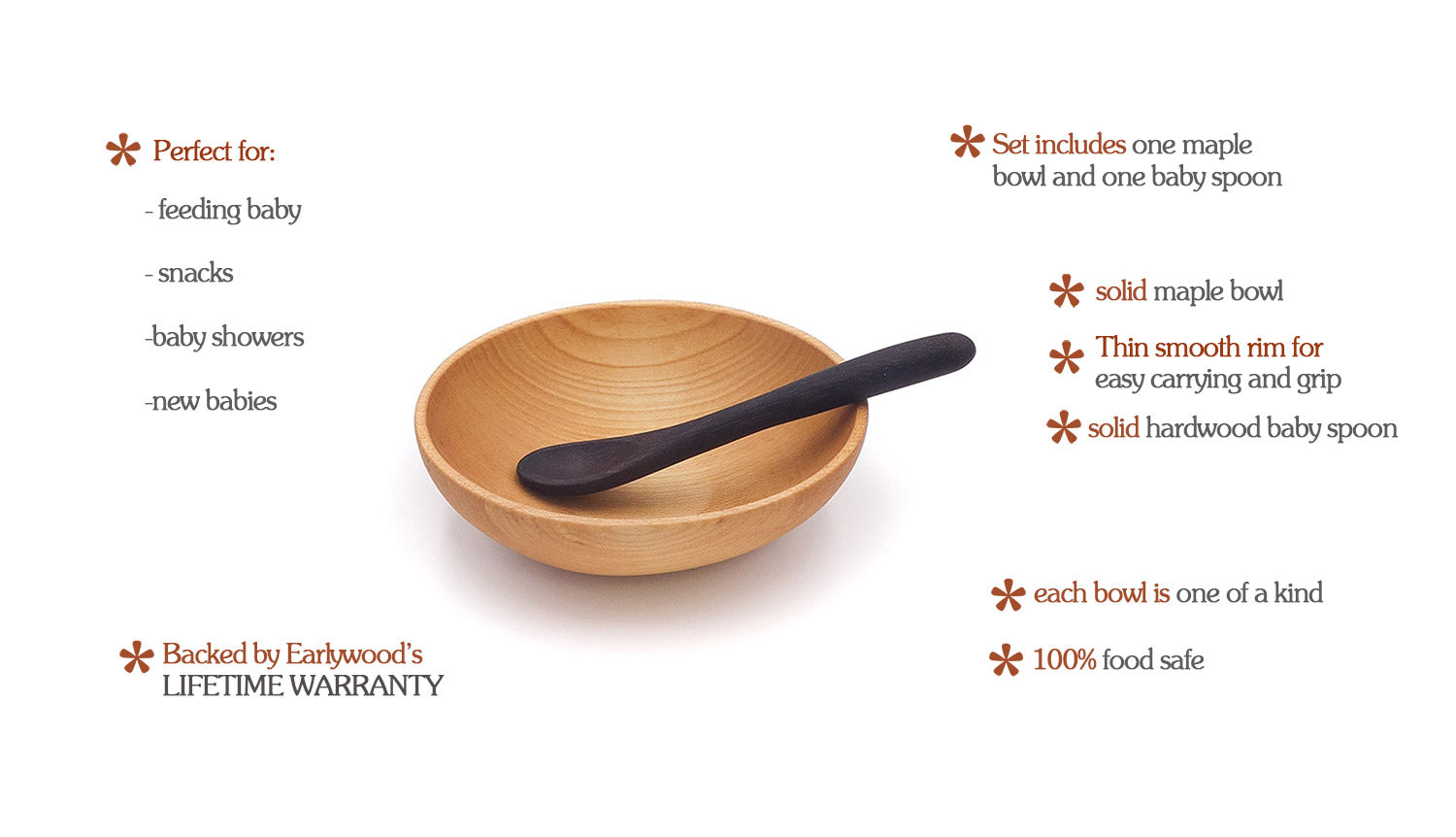 Our 5 inch maple wooden baby bowl is perfect for babies who are old enough to be fed soft foods. Perfectly paired with our hardwood engravable baby spoon that holds just the right amount for a good bite while the narrow width makes feeding easy and clean. This combination makes the perfect family heirloom and baby shower gift.