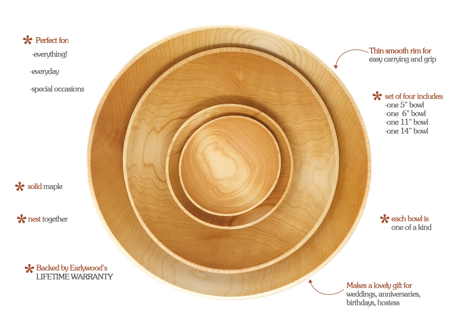 This wooden bowl set covers all the bases. Our largest 14 inch bowl is perfect for large gatherings of family and friends. The ample 11 inch bowl is perfect for serving up weeknight dinners or salads. Our 6 inch bowl is the perfect size for single servings or dips for a crowd. Don't forget the 5 inch bowl for food prep, nuts, condiments and even for feeding baby.
