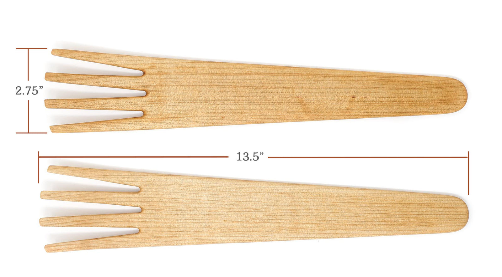 At about 13.5" long, these wood salad forks fit nicely into any bowl without falling out. Made from hard maple these will last generations and also excel at serving pasta dishes.